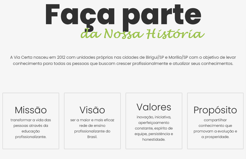 Via Certa, por meio da união de três sócios com mais de duas décadas de experiência na educação profissionalizante, a Via Certa nasceu em maio de 2012, em Birigui/SP.